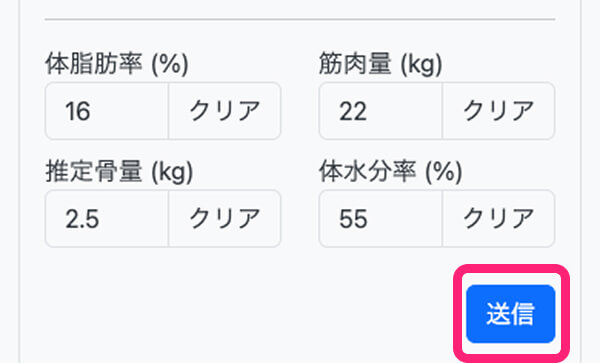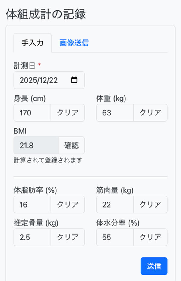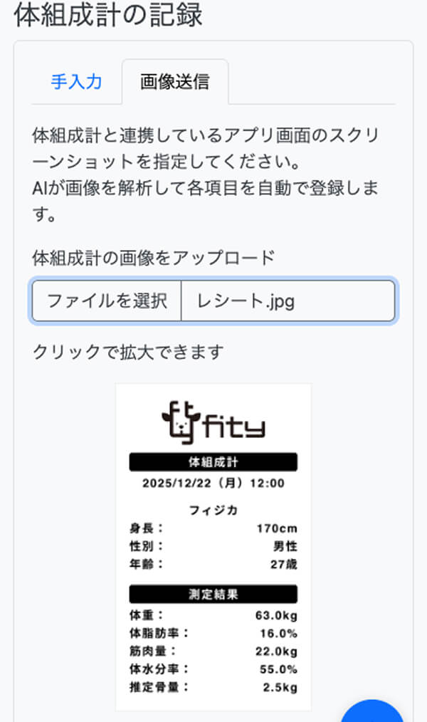 お使いの体組成計によってはアプリと連動させて記録が可能なものがあります。そのアプリの記録画面のキャプチャを撮り、「画像送信」から自動読み取りで登録することができます。
