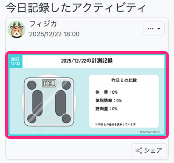 マイページやタイムラインにて、体組成計の画像をクリックすると前回登録時と比較した数値を確認する事ができます。