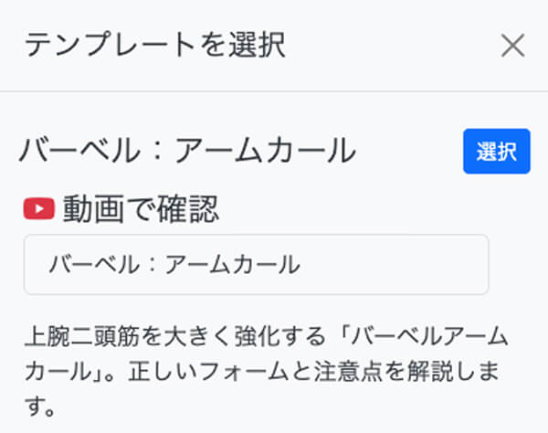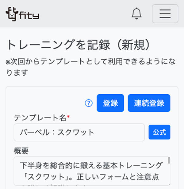 ここで登録した内容は、自動的にテンプレートとして登録され、次回以降同じトレーニングをする際は入力を短縮することができます。